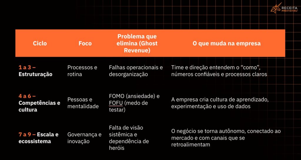 O que realmente muda o jogo Nosso foco não é escrever um “Receita Previsível 2.0”. É reorganizar a forma como as decisões acontecem para o negócio parar de depender de improviso e de heróis.