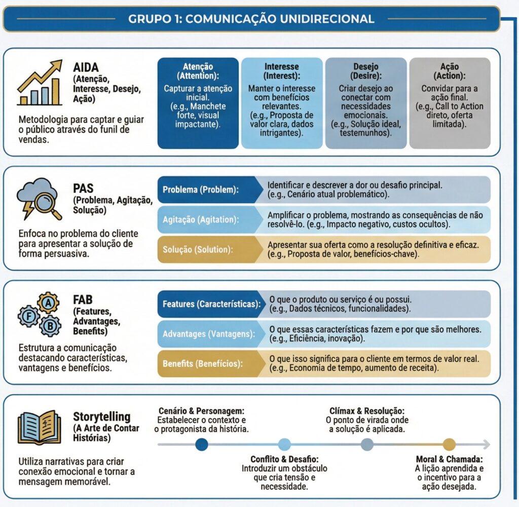 Aqui, o foco não é descobrir a dor pela conversa, mas arquitetar a mensagem certa para que ela funcione sozinha. As técnicas mais úteis nesse grupo são: