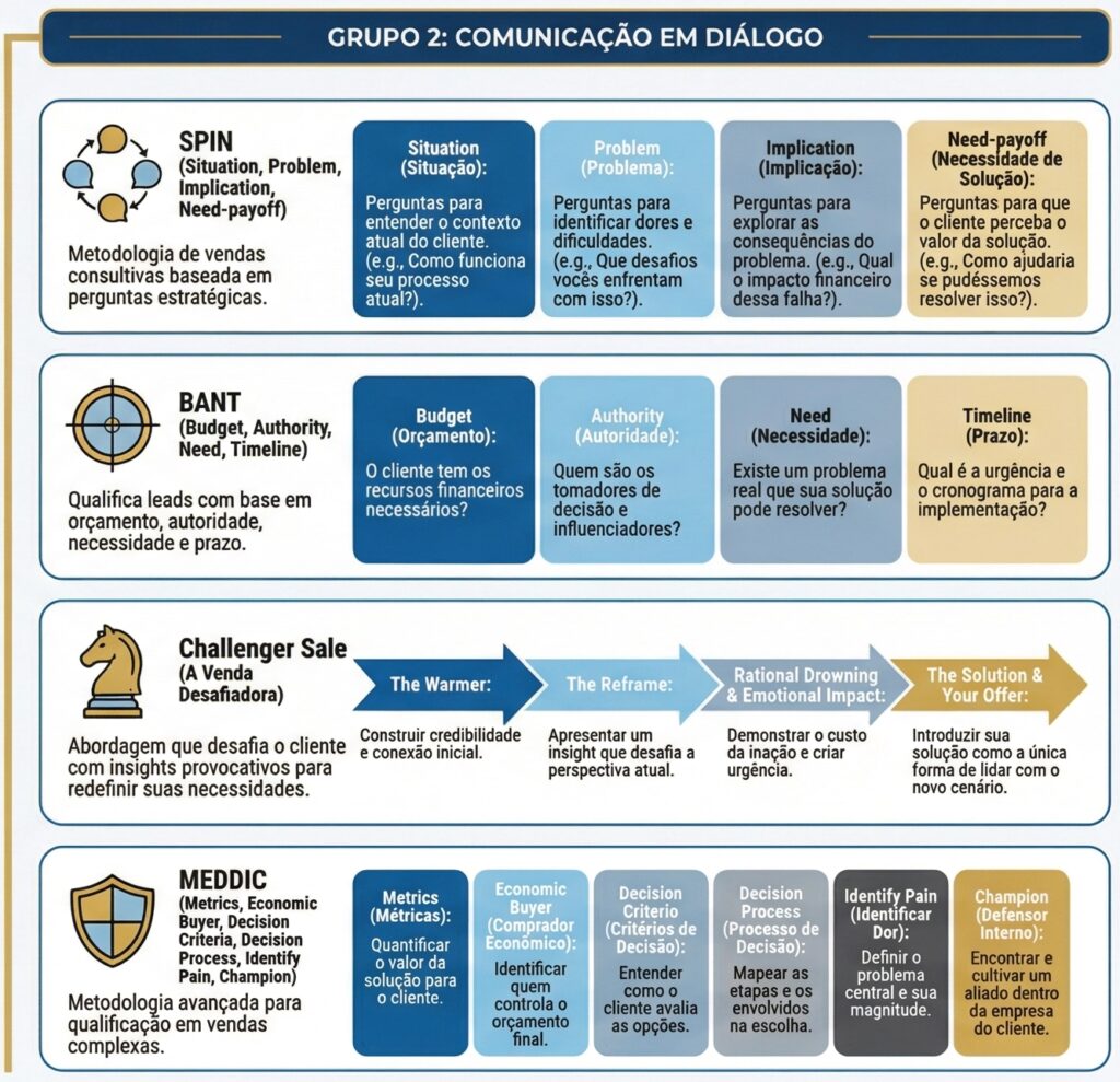 Quando usar: Enterprise sales, contratos de alto valor, vendas longas, ambientes com múltiplos stakeholders. É para quando a venda depende de mapear e navegar o sistema de decisão, e não apenas convencer uma única pessoa.