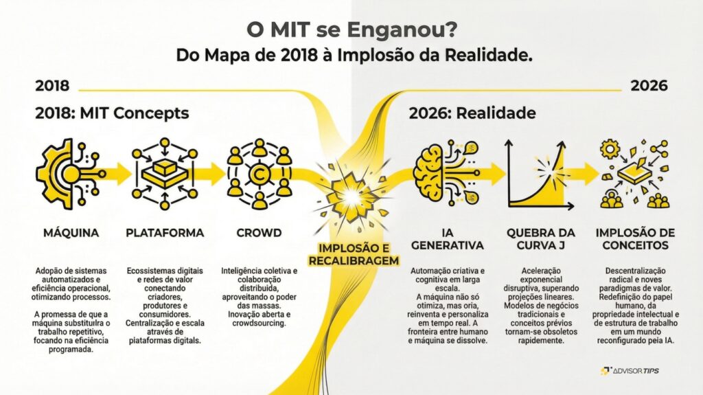 Em 2018, eu estava nas salas de aula do MIT Sloan, achando que tinha encontrado o mapa do tesouro. O curso era o “Digital Business Strategy: Harnessing Our Digital Future”. Os professores? Andrew McAfee e Erik Brynjolfsson, que eram para mim os sumos sacerdotes da era digital. A tese deles, imortalizada no livro Machine, Platform, Crowd, era o "beabá" da sobrevivência: a Máquina (IA analítica) ampliaria nossa mente, as Plataformas dominariam os mercados e a Multidão (Crowd) distribuiria o poder. Terminei esse curso com a cabeça explodindo, convencido de que, se dominasse esses pilares, eu saberia navegar nesse jogo.