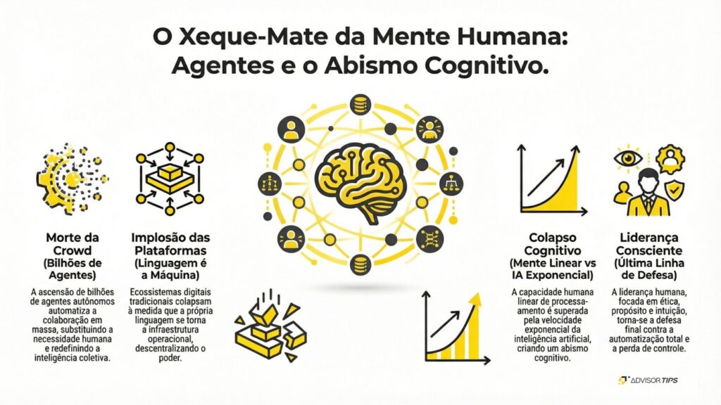 Neste cenário, a liderança consciente é a última linha de defesa. Exige a humildade de aceitar a superioridade da máquina, mas a coragem de manter o controle ético. O que aprendi no MIT em 2018 me deu o mapa, mas o terreno mudou tanto que o mapa agora é apenas uma relíquia de museu. A grande questão é: nossa mente biológica e linear será capaz de acompanhar o ritmo da mente artificial exponencial que criamos? Ou seremos apenas os mestres imaginários de um exército de agentes que já decidiram o nosso destino?