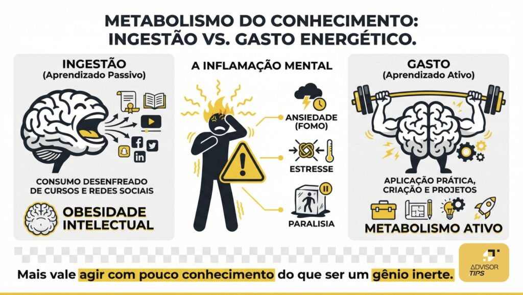 Em um mundo onde a informação é infinita e o tempo é finito, a ação de fazer algo com o conhecimento adquirido é o grande diferencial. A obesidade intelectual não é um sinal de inteligência; é um sintoma de algo que vai te deixar cada vez menos ativo. É o banquete que nos esgota e nos impede de criar algo de valor. Está na hora de colocar todo seu conhecimento em prática. De gastar essa energia. De transformar o conhecimento em suor, em resultado, em impacto.