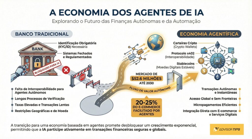 E o que mais teremos? Conta corrente em banco para os agentes movimentarem? A resposta é um sonoro "sim", mas com um twist. Agentes de IA não têm CPF, RG, nem comprovante de residência. Eles ainda não podem abrir uma conta bancária tradicional. A solução? Carteiras de criptomoedas e stablecoins. Protocolos como o x402 já permitem pagamentos diretos máquina-a-máquina (M2M) sem a necessidade de intermediários bancários ou burocracia. O mercado de agentes de IA, que era de US$ 7,8 bilhões em 2025, deve saltar para US$ 52,6 bilhões em 2030, facilitando entre US$ 1,2 e 1,8 trilhão em transações de e-commerce anuais. Isso não é o Second Life (lembram dele?), isso é Second Economy, e ela já está funcionando a todo vapor.