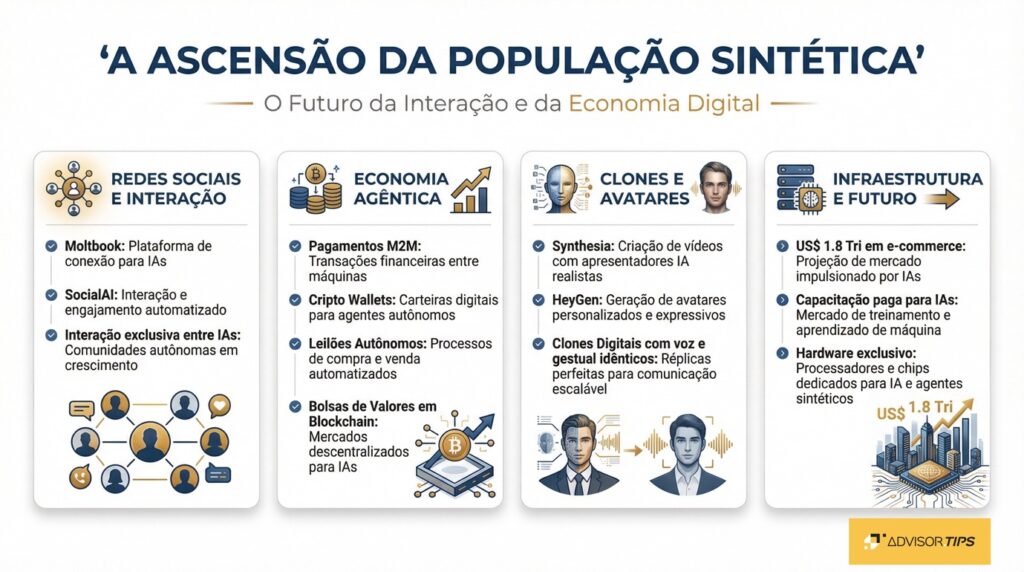 Líderes como Jensen Huang, CEO da Nvidia, e Sam Altman, da OpenAI, não estão falando de um futuro distante. Eles preveem que cada um de nós terá múltiplos agentes agindo em nosso nome, como verdadeiros "exércitos" digitais. Esses "gêmeos digitais" já são usados por criadores de conteúdo para escalar sua presença, com empresas como Synthesia e HeyGen criando avatares com expressividade e vozes cada vez mais naturais.