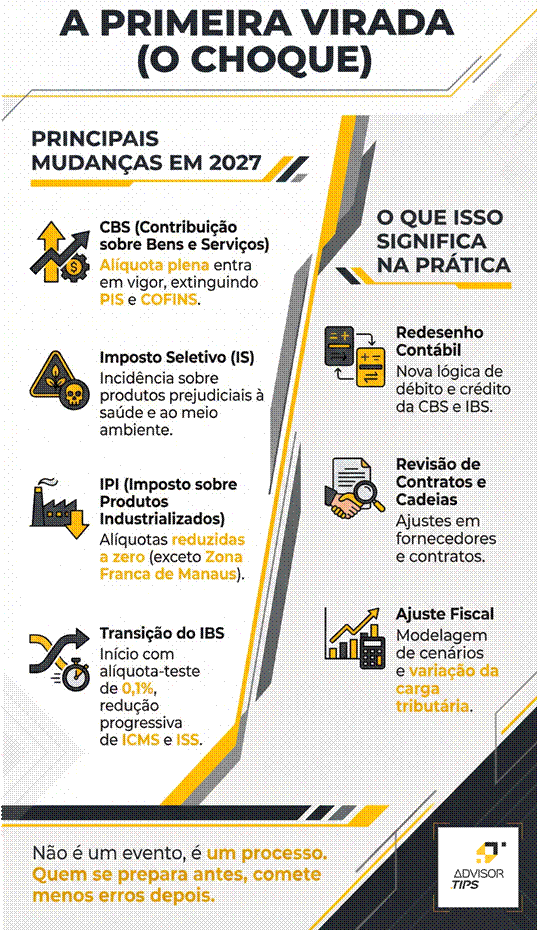 Não se engane: 2027 não é um "próximo passo". É a separação para quem não construiu a ponte. É o momento em que o PIS e a Cofins morrem de vez e a CBS assume o controle com alíquota padrão. É quando o IPI vira fumaça (exceto para proteger Manaus) e o Imposto Seletivo começa a morder. Se você deixar para entender isso em dezembro de 2026, oi ainda ao longo de 2027, você já perdeu. O arrependimento será o seu maior custo operacional.